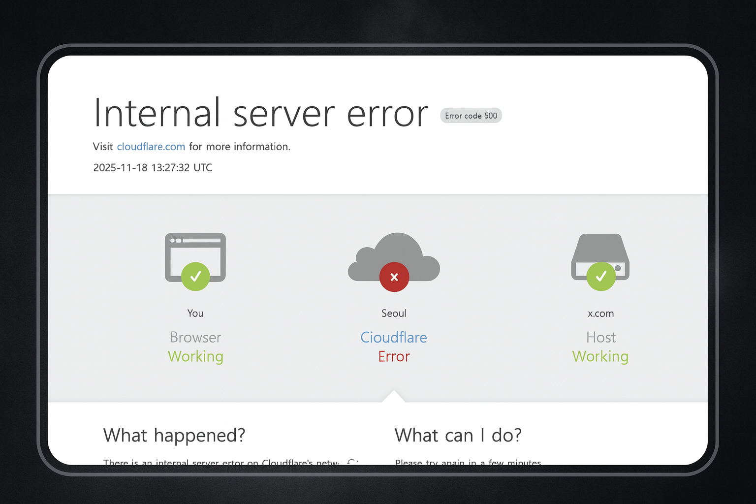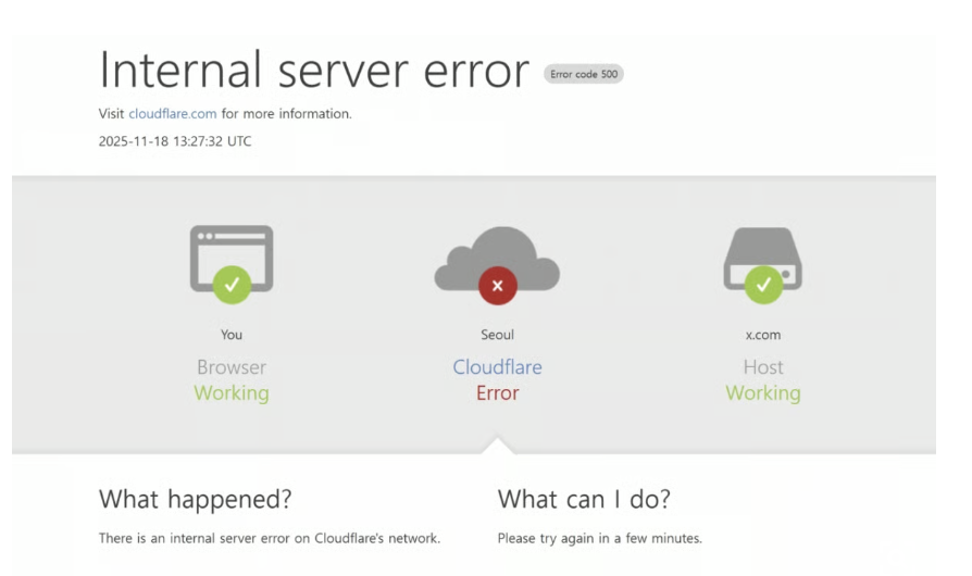 갑자기 챗GPT와 X 접속이 안 되고 오류 메시지가 뜨고 있나요? 현재 전 세계적으로 클라우드플레어 글로벌 장애가 발생한 상황이며, 사용자 기기 문제와는 무관합니다. 먼저 아래 복구 가능 여부를 확인해보세요.
